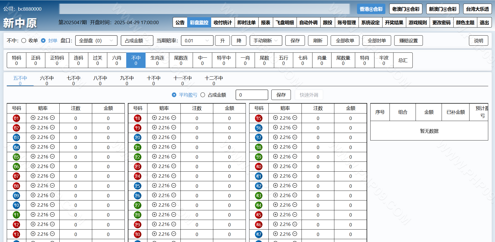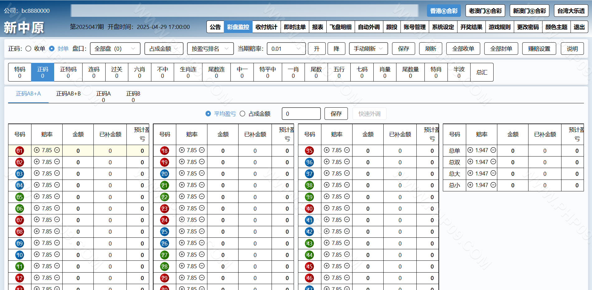 特色①后台可单独开启或关闭任意一个代理及会员的彩种。任意更改公司名称及安全码。可单独设置任意一个代理的赚赔率功能,可设置自动外调(自动生成外调注单)